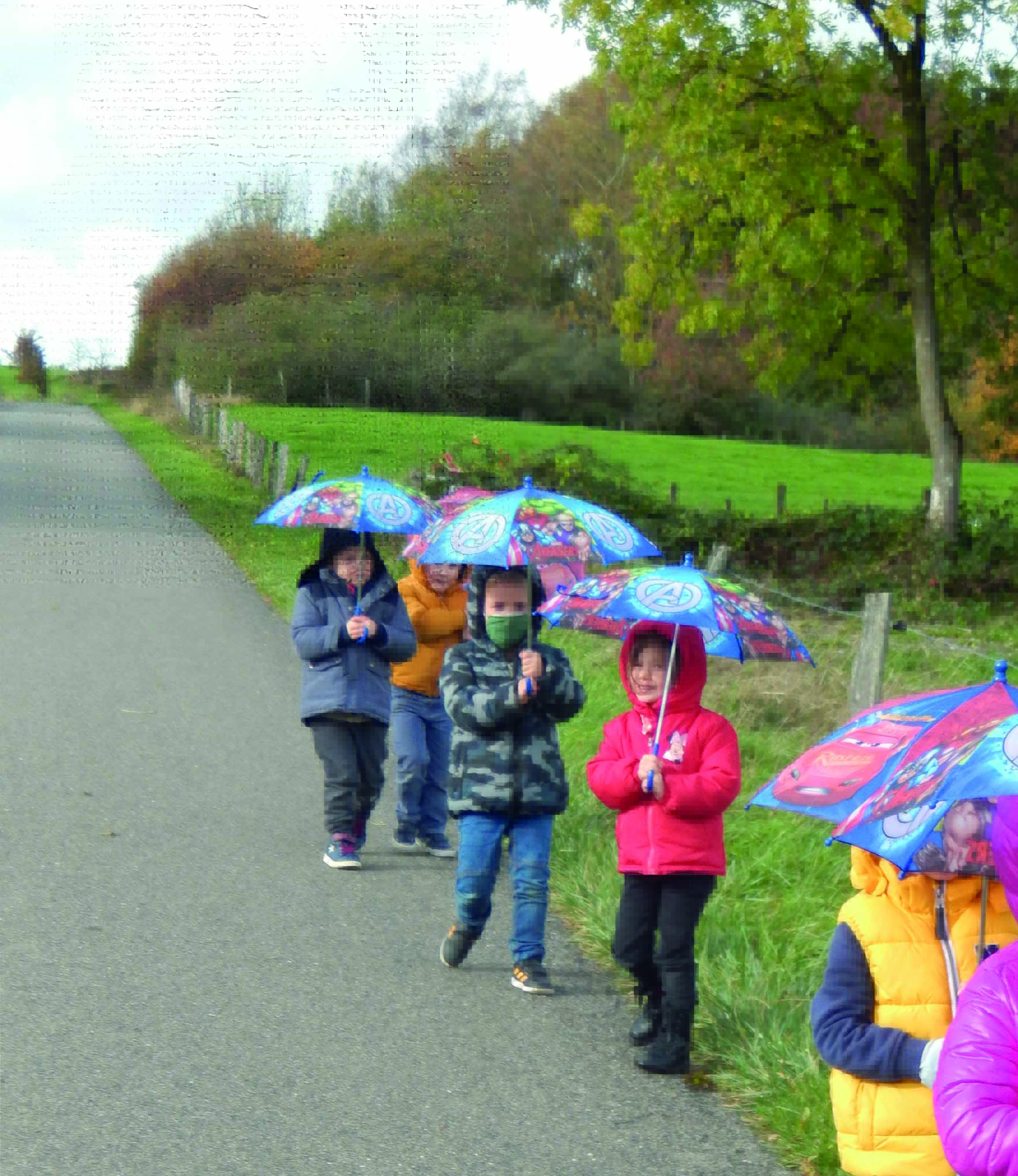 Au fil du temps et des saisons, faisant fi de la météo, sous leur parapluie, les enfants pour leur plus grand plaisir et celui des personnes rencontrées en chemin, s’en vont par monts et par vaux.