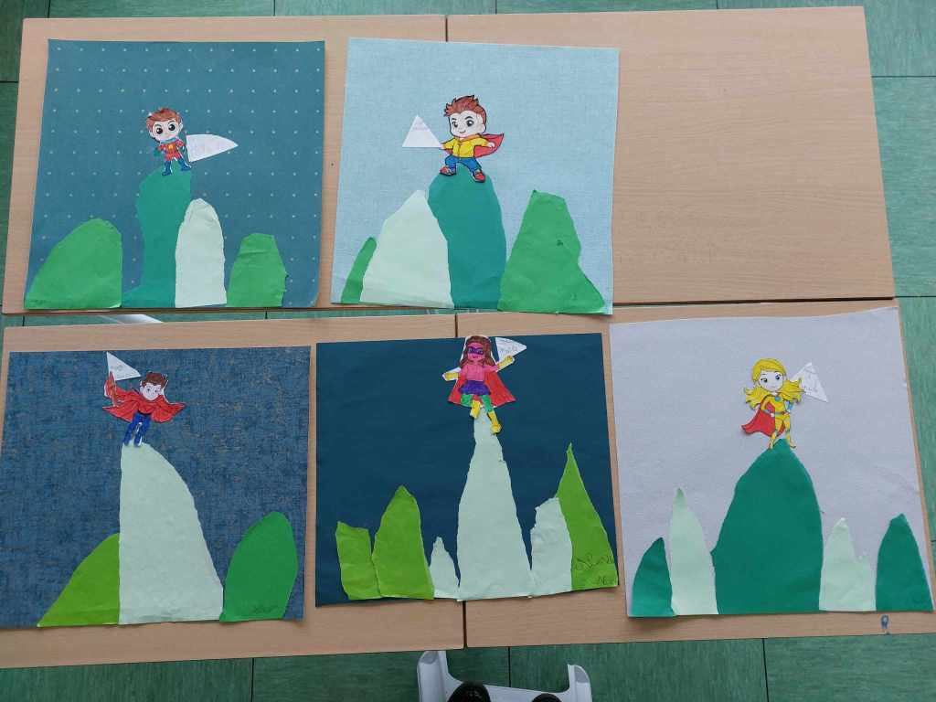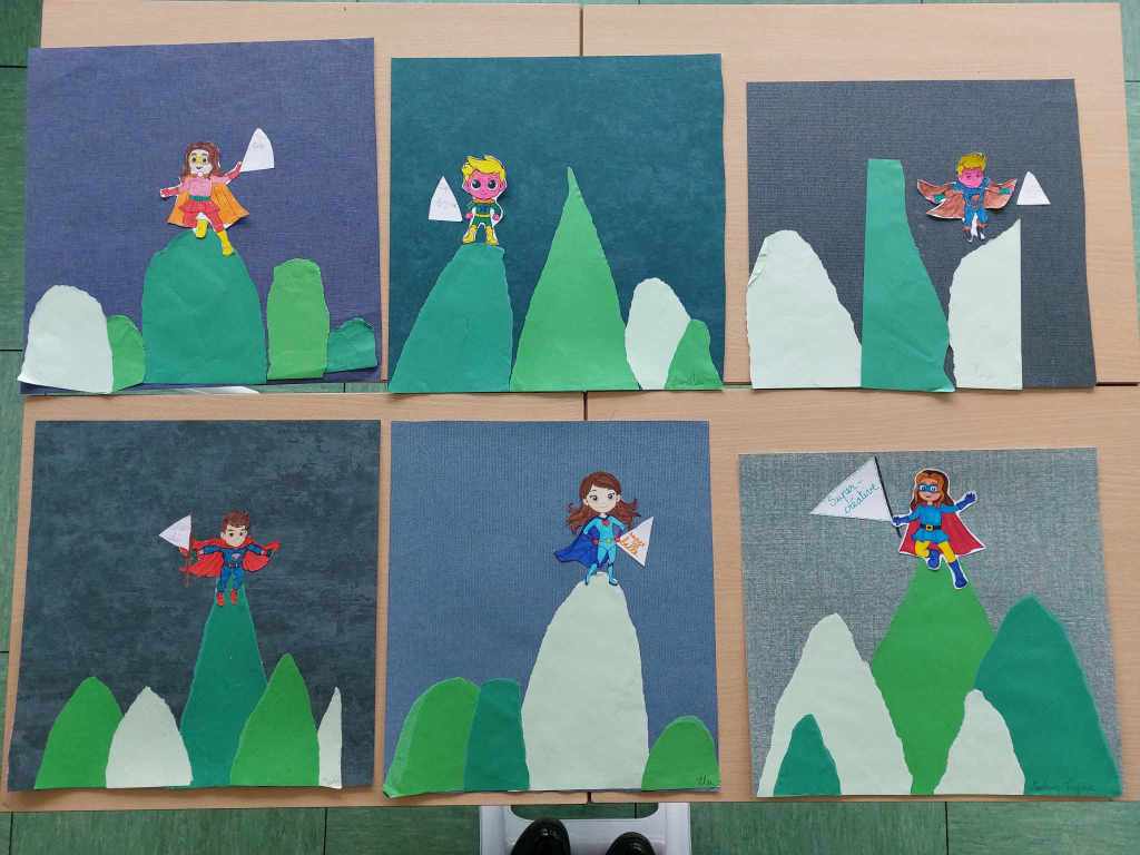 Tout comme l’héroïne, Jeanne, qui a décidé de se surnommer « L’incroyable Désordonnée », chaque élève a dû trouver son super pouvoir🤩 et se représenter tout en haut d’une montagne. Dans les fanions, j’ai pu lire: super belle, super partageuse, super créatif, super footballeur, super râleur… 🙂