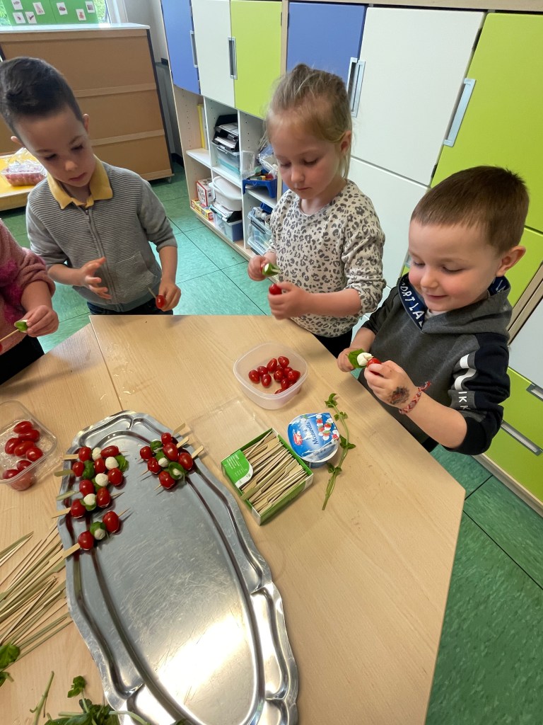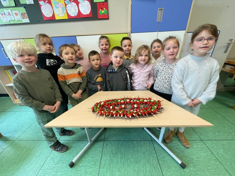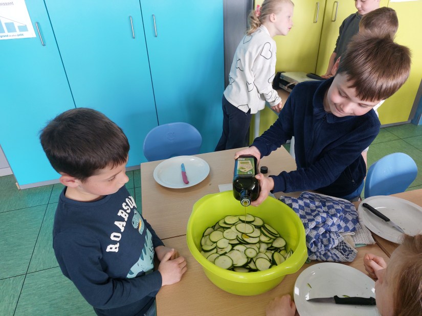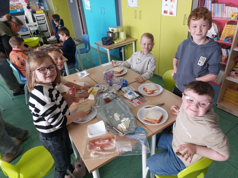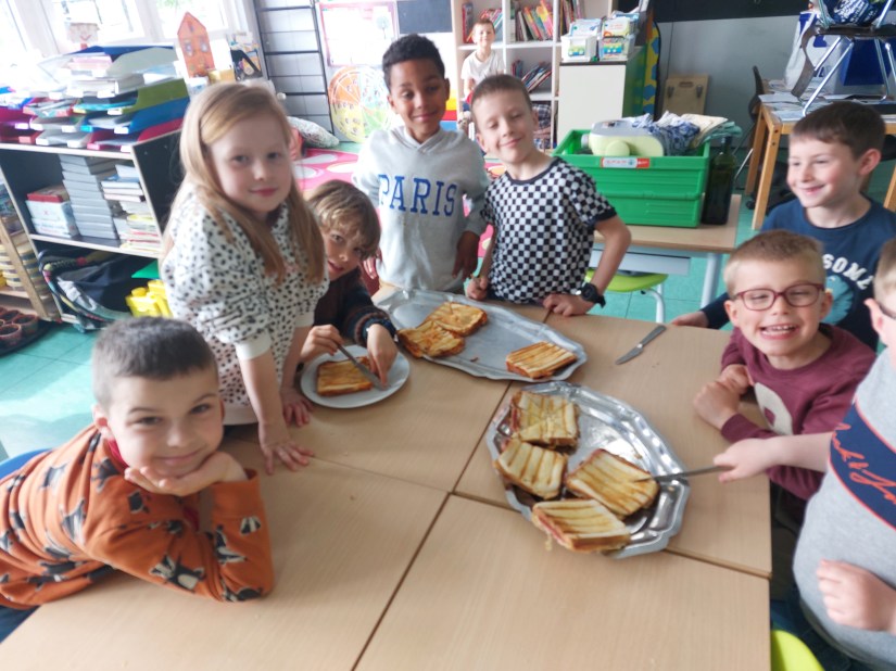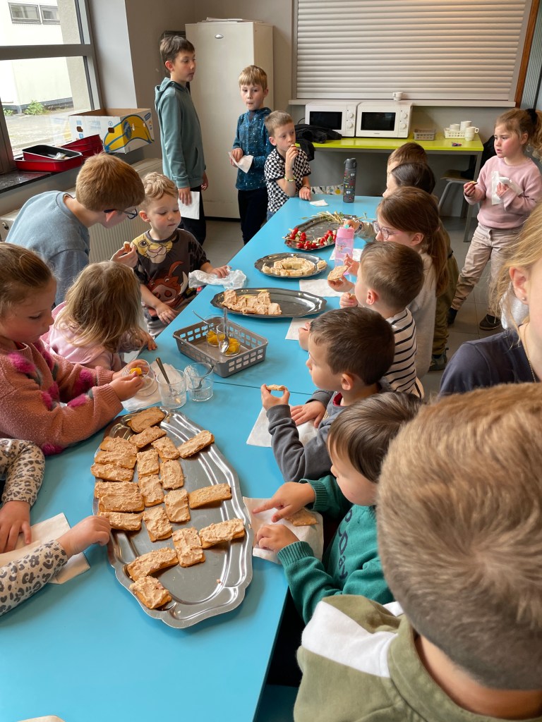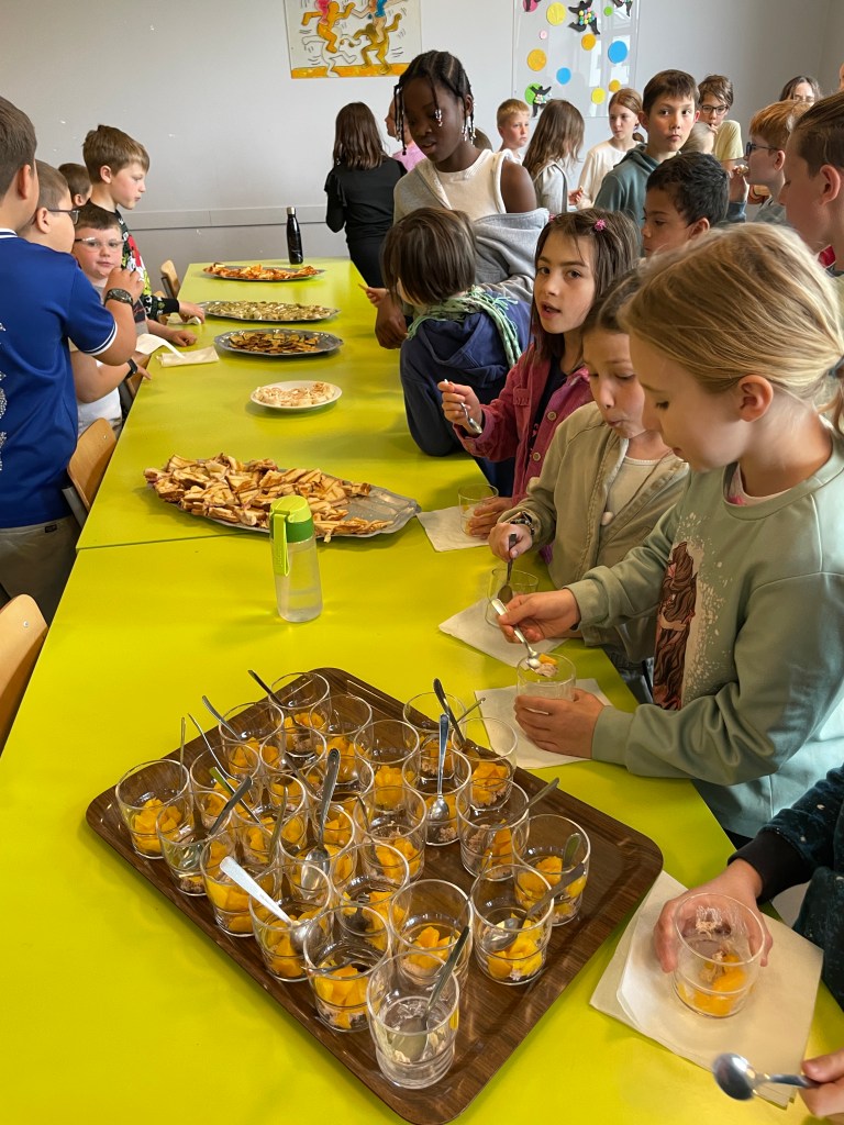 Les maternelles ont préparé des toasts avec de la salade de thon et des brochettes de tomate-mozzarella. Les P1-2 ont préparé des croques-monsieurs classiques et italiens et des chips de courgettes au parmesan. Les p3-4 ont concocté des verrines de pêches au thon ainsi que des bouchées d’ananas et pruneaux lardés. Les P5-6 ont cuisiné de l’houmous et des pommes de terre grenaille au fromage.